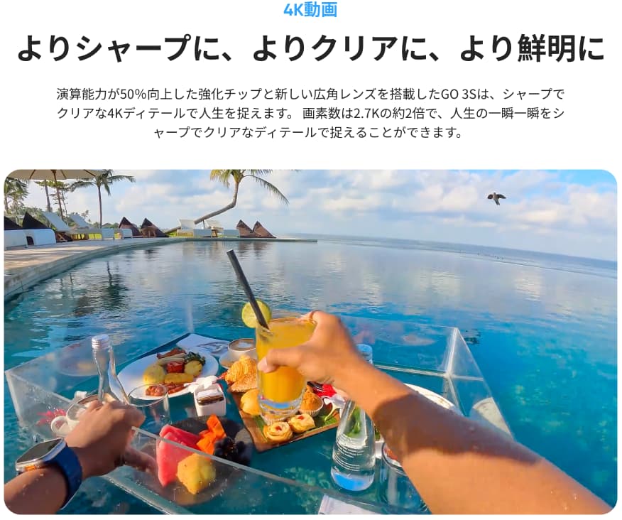 Insta360 GO 3Sが最も注目されるポイントのひとつ。それは、動画撮影解像度の4K30P対応です。高解像度が追加されたことで、映像のディテールが飛躍的に向上しました。