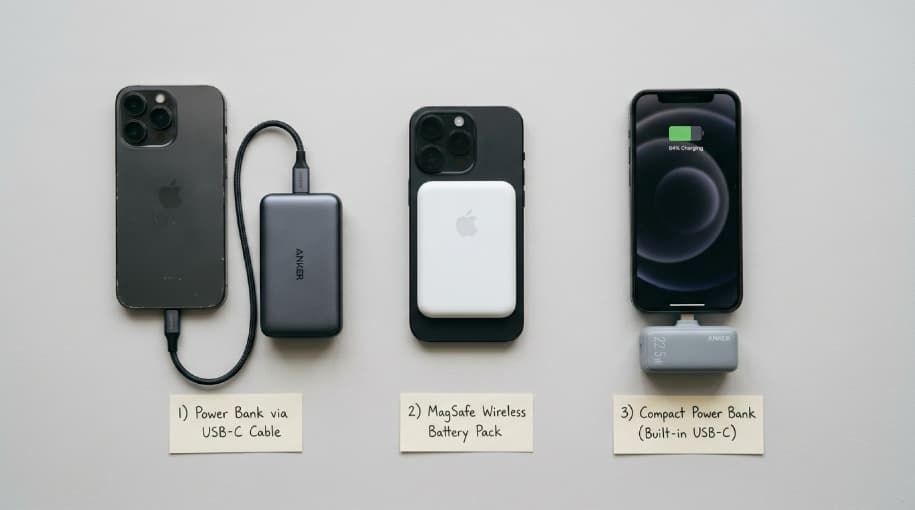 iPhone 11・iPhone SE(第2世代)以前のモデルはLightningケーブル接続になります。この世代のiPhoneを使っている場合は、Lightning対応のモバイルバッテリーを選ぶか、USB-C to Lightningの変換コネクタを1つ持っておくと便利です。最近はこの世代のユーザーも少なくなってきましたが、念のため確認しておくといいでしょう。