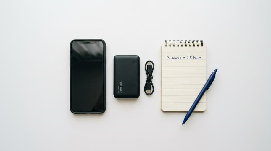 10,000mAhあれば理論上は1.5〜2回フル充電できますが、変換ロスを考えると実質1〜1.5回分。5,000mAhでも試合3本+αは十分カバーできます。