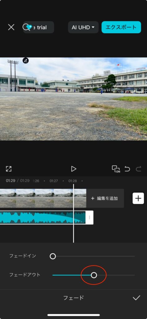 - 必要に応じてフェードを調整し、動画の最後の方でBGMをフェードアウトさせる