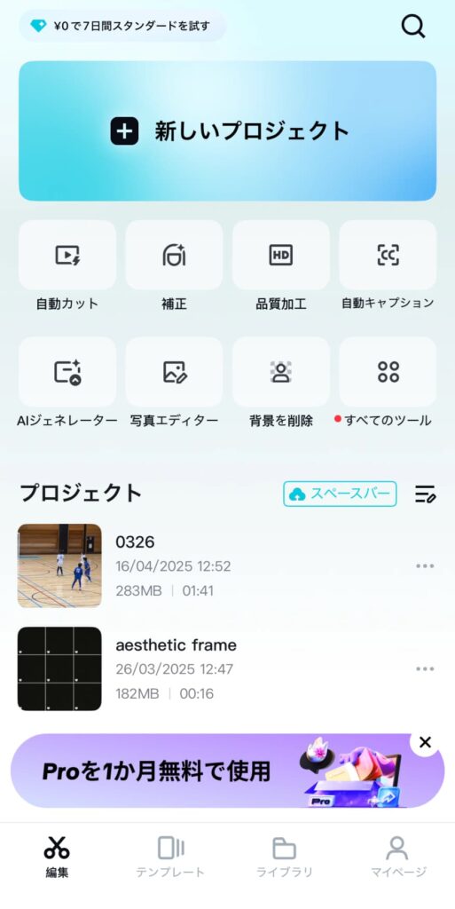 - CapCutを開き、「+新しいプロジェクト」をタップ