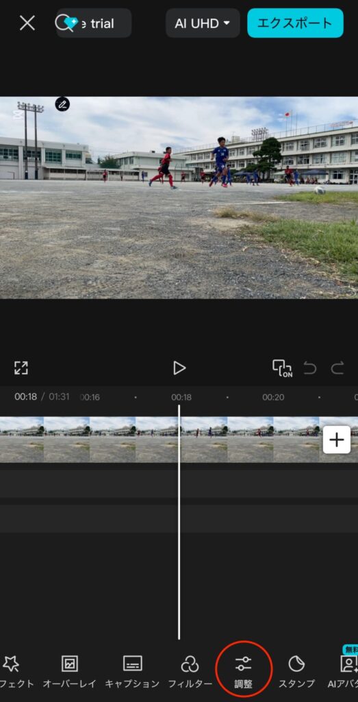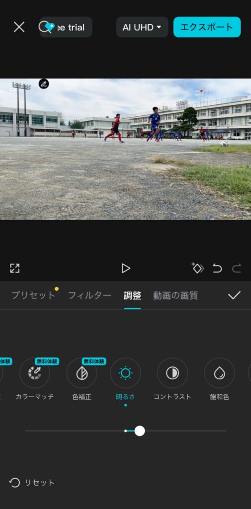 💡屋外の曇り試合は、明るさとコントラストを上げるだけで見違えます。