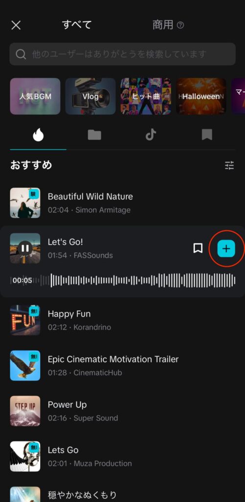 💡自分のスマホ内の曲も使えます。ただ、SNS投稿なら著作権フリーのBGMが安心です。