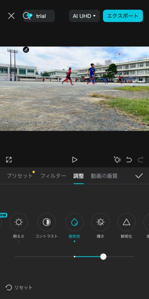 - 「飽和色」を少し上げると、芝の緑やユニフォームなどが鮮やかになります